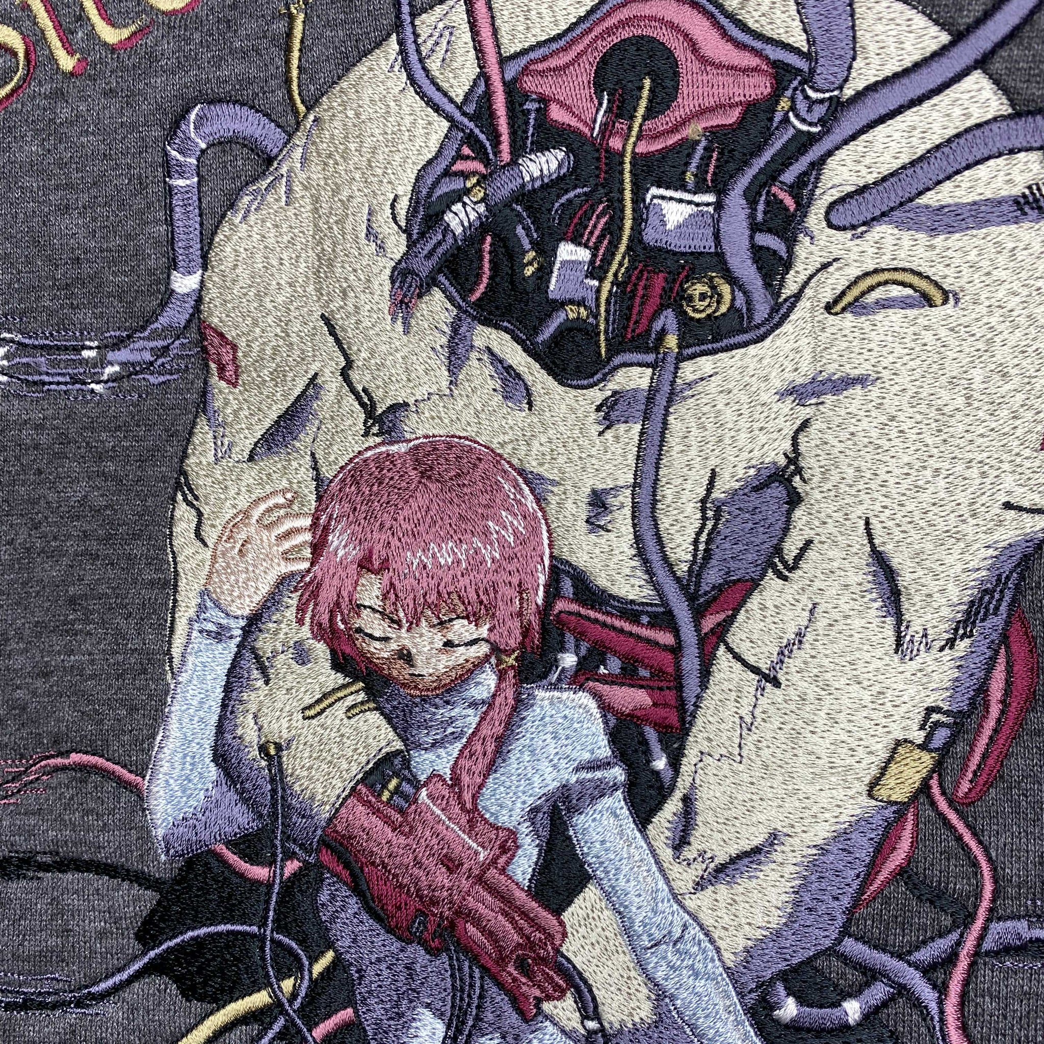 Recreated in exquisite embroidery, this piece captures one of the most memorable scenes from the 1998 PlayStation game serial experiments lain: the moment when Lain finds both comfort and a sense of awakening while resting in the arms of the “Father” she constructed.