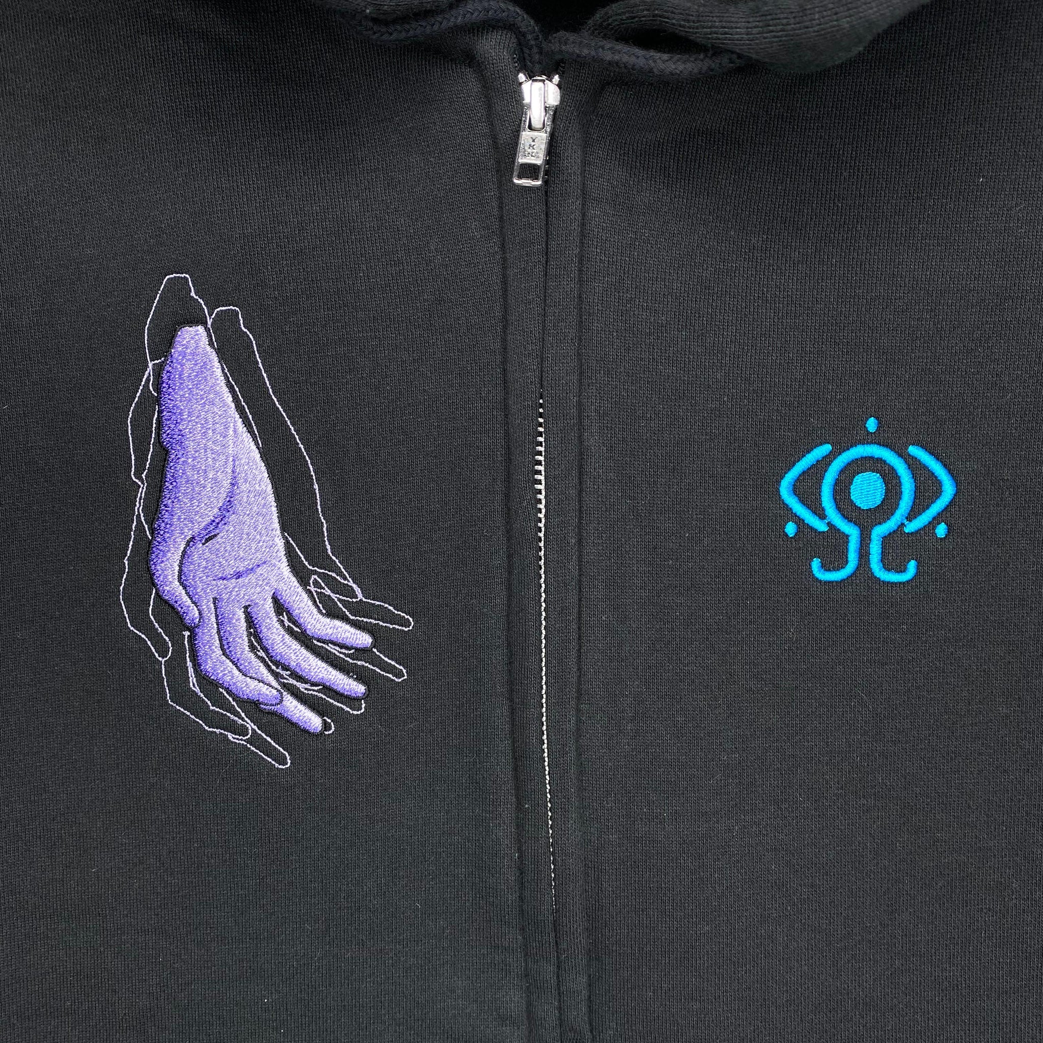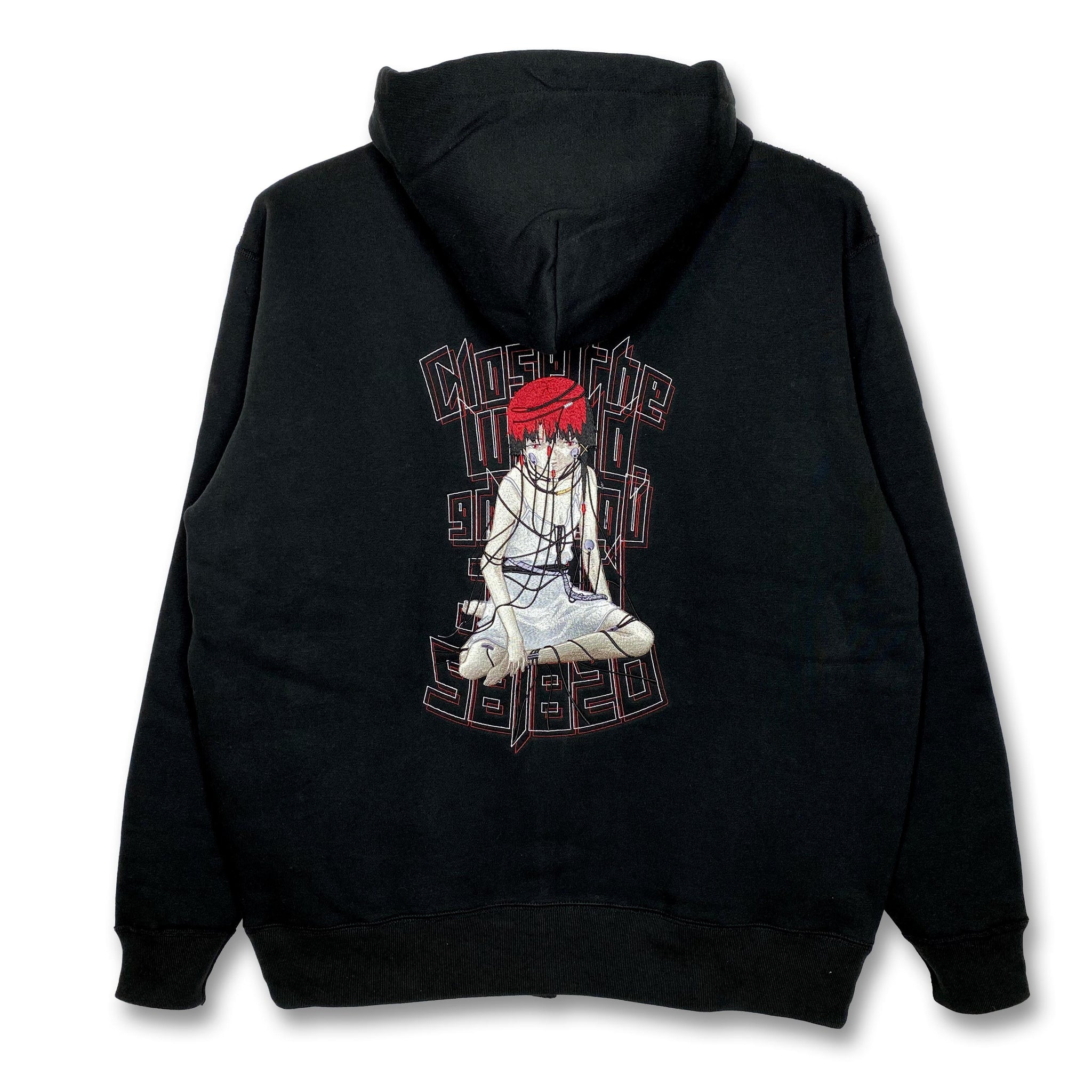 Introducing the “Wired Maiden Embroidered Zip Hoodie,” a fully embroidered recreation of the iconic “Guruguru Lain,” where Lain wraps cables around her body and connects to the Wired in Layer:11 INFORNOGRAPHY from the serial experiments lain anime.