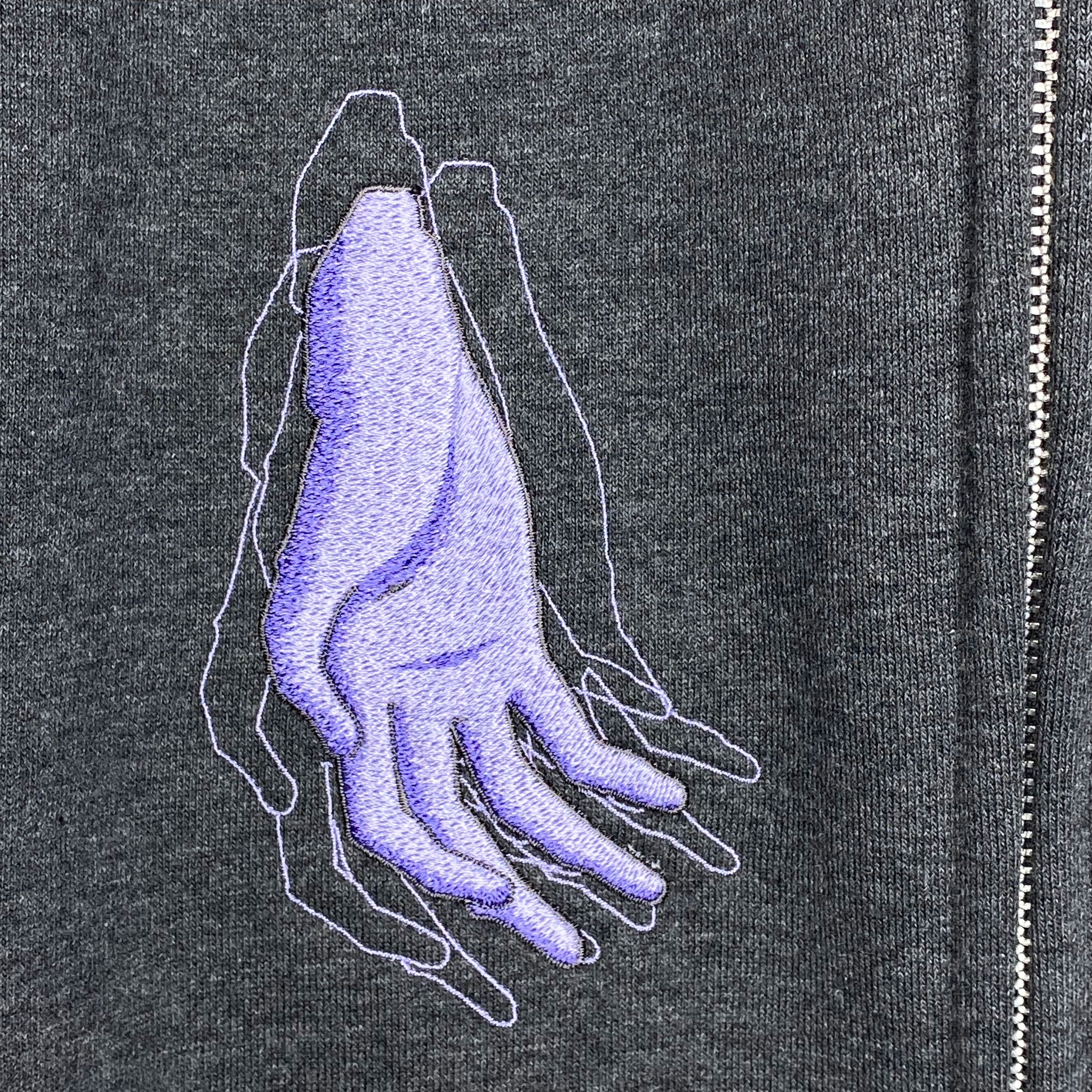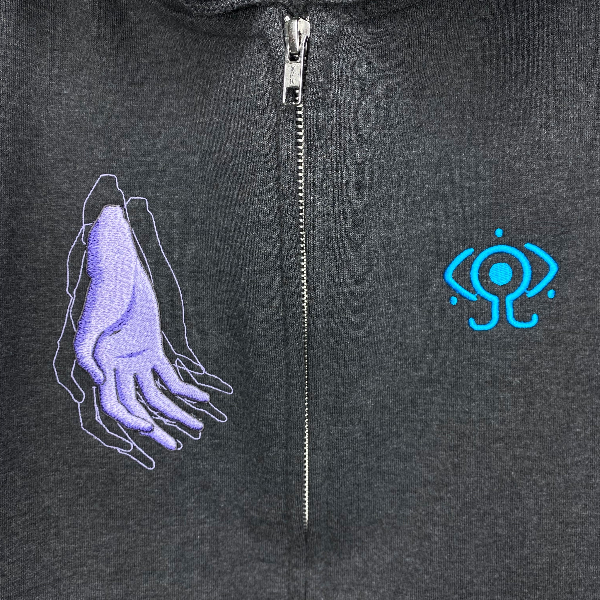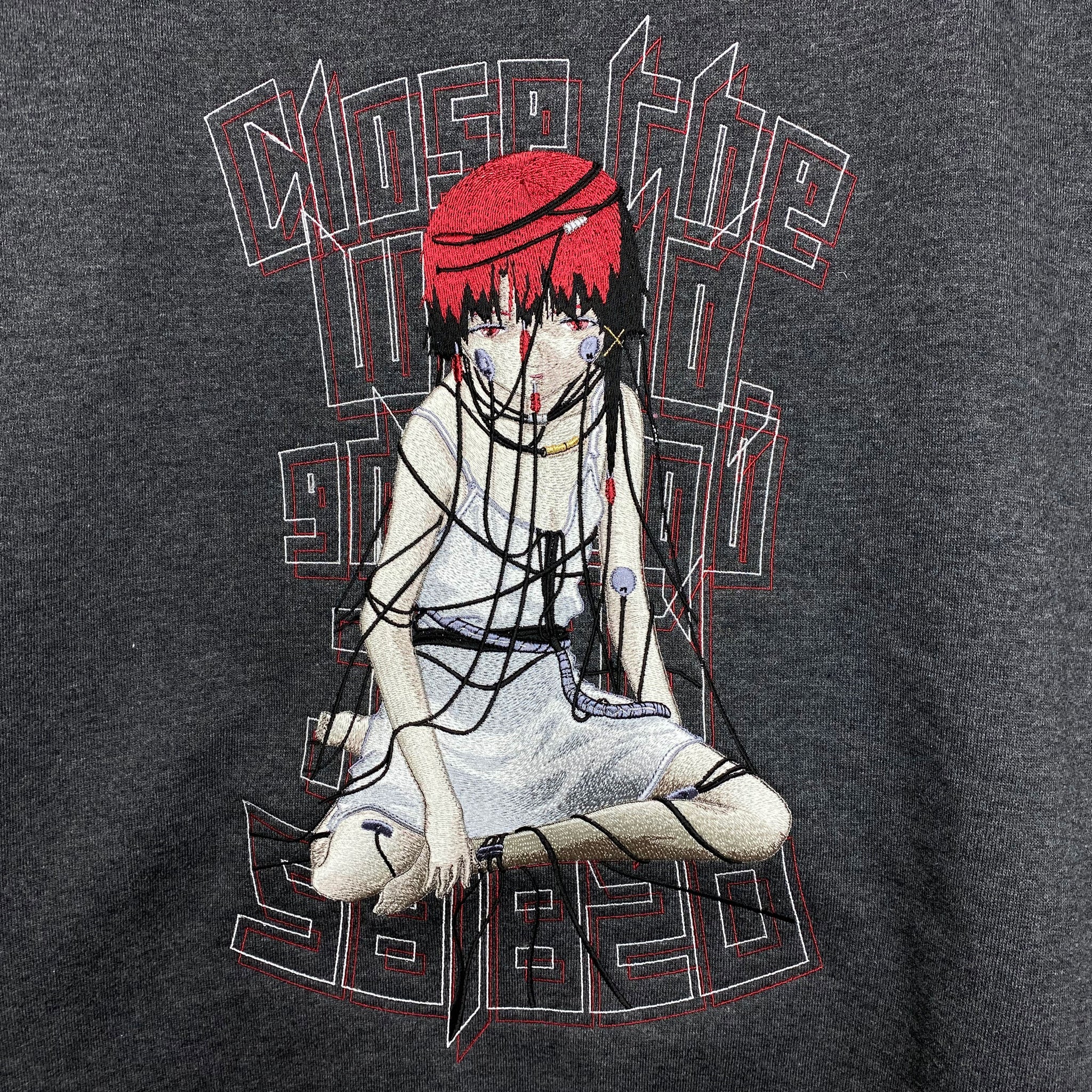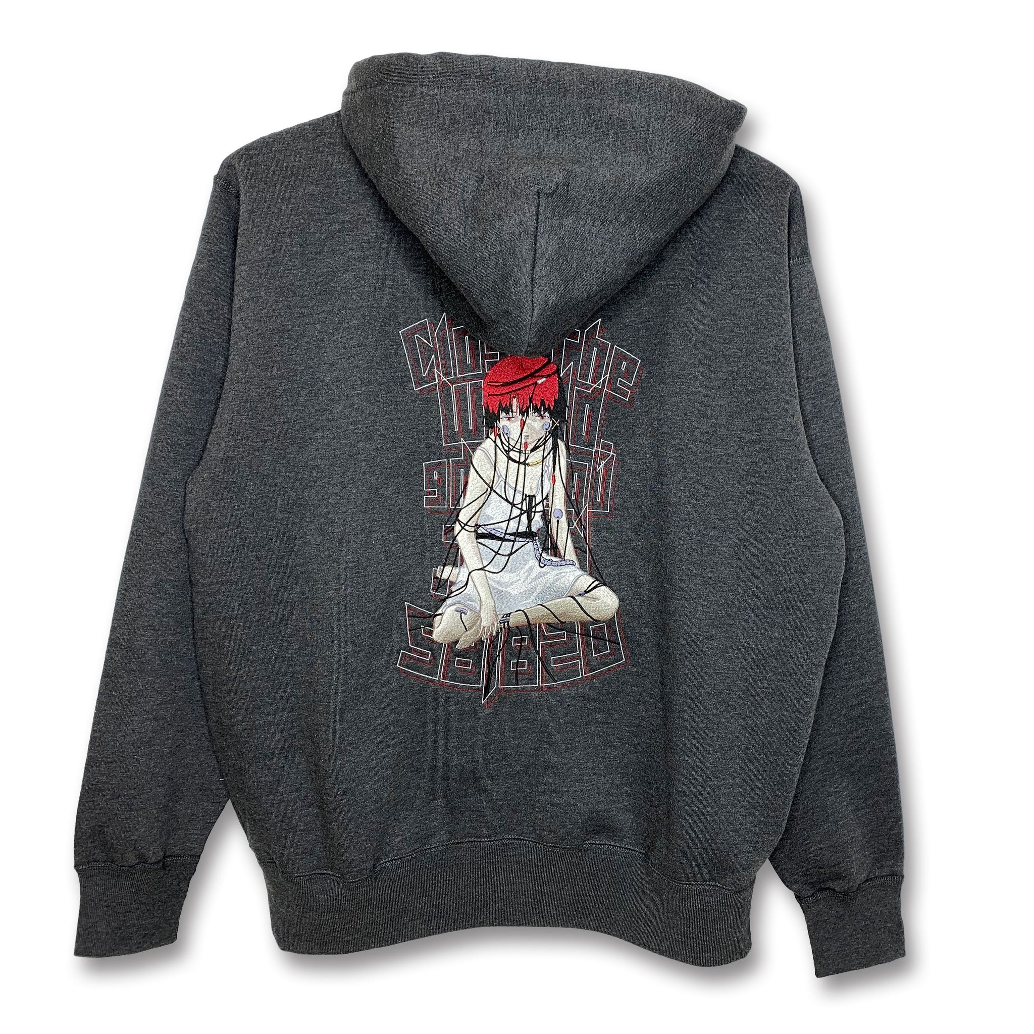 Introducing the “Wired Maiden Embroidered Zip Hoodie,” a fully embroidered recreation of the iconic “Guruguru Lain,” where Lain wraps cables around her body and connects to the Wired in Layer:11 INFORNOGRAPHY from the serial experiments lain anime.